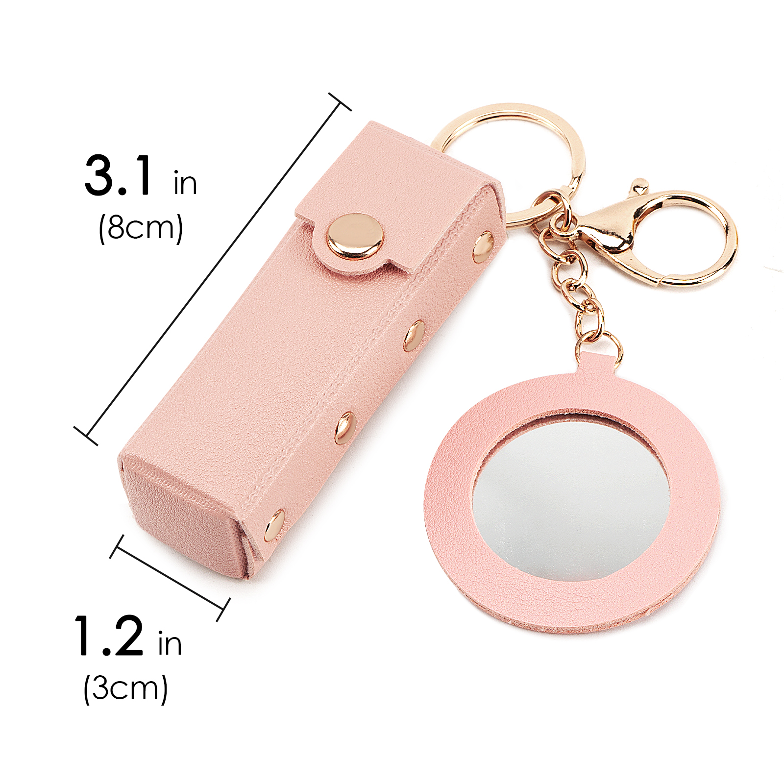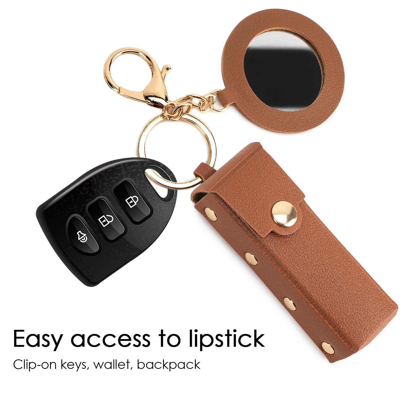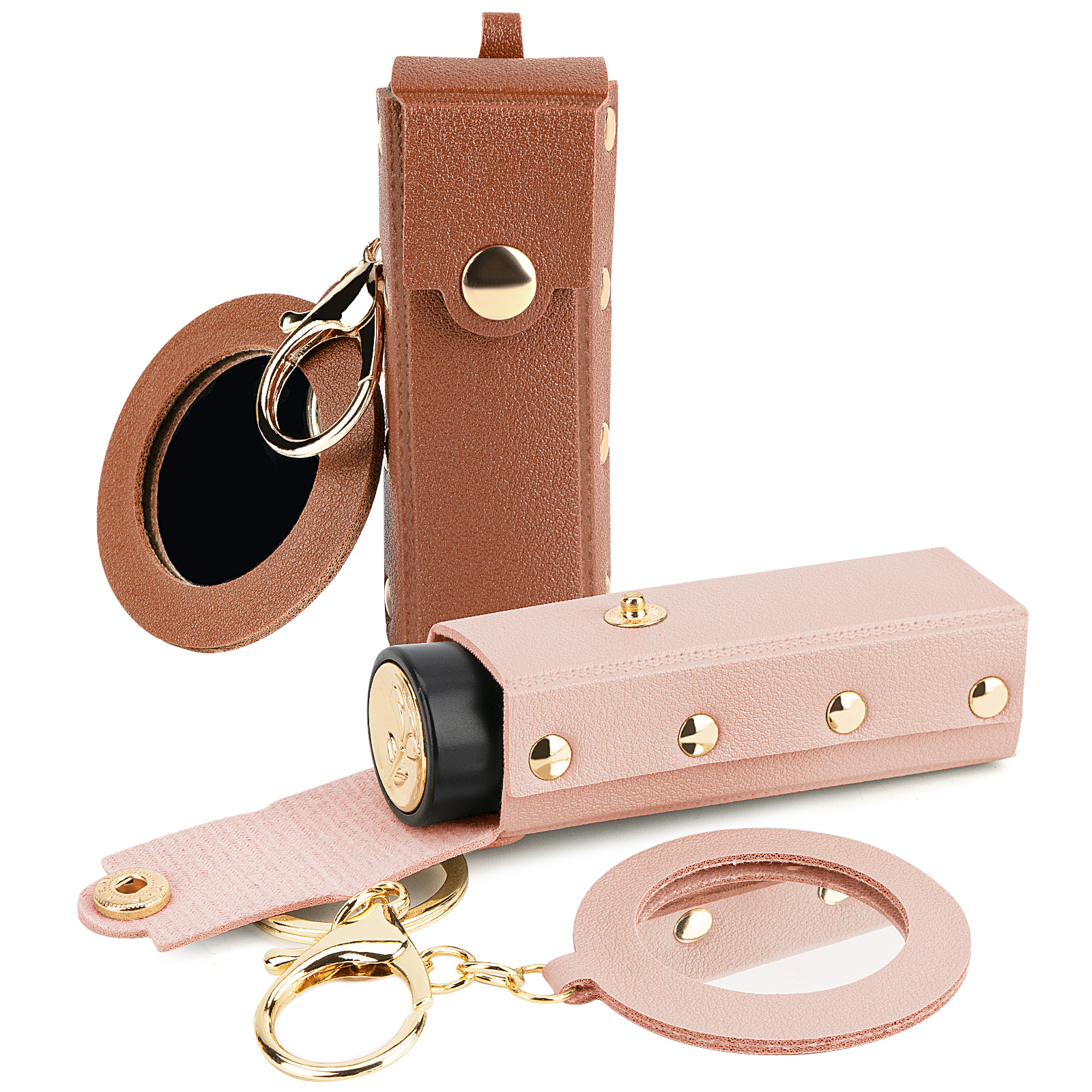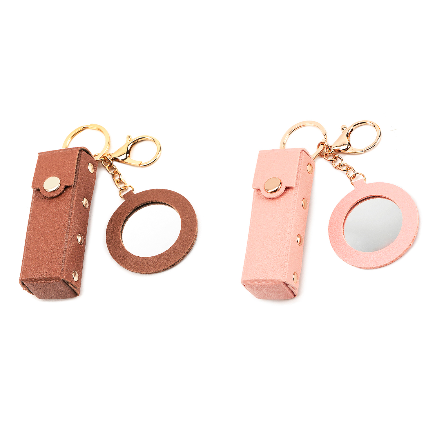 Pack Lipstick Organizer Keychain, Leather Lipstick Case with Mirror for Women, Portable Lip Gloss Bag Lip Balm Holder for Travel (Brown & Pink)
