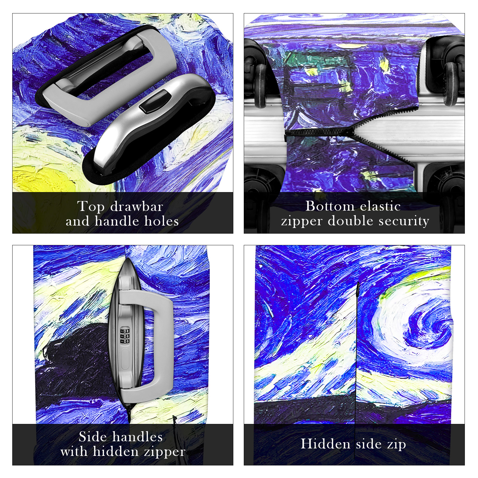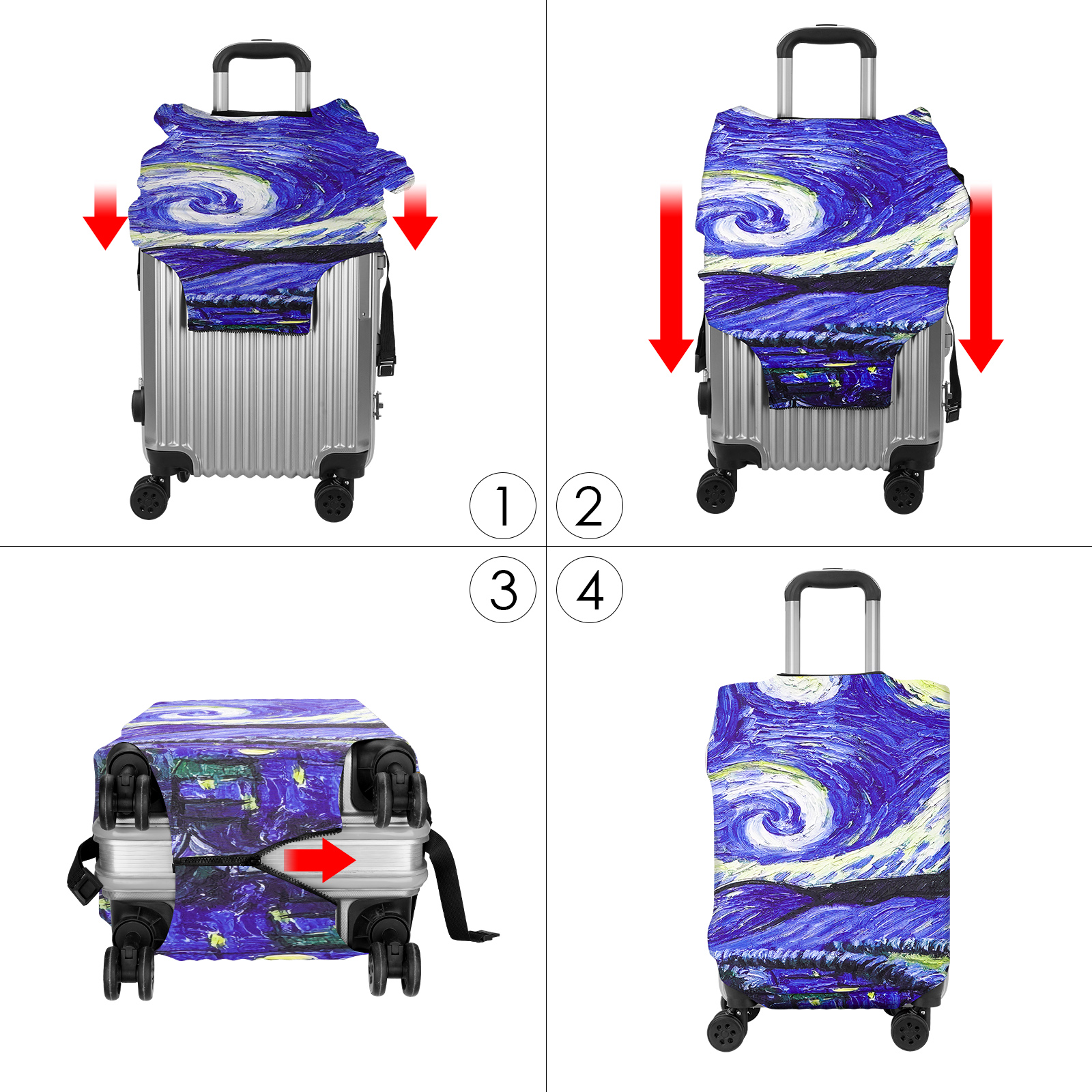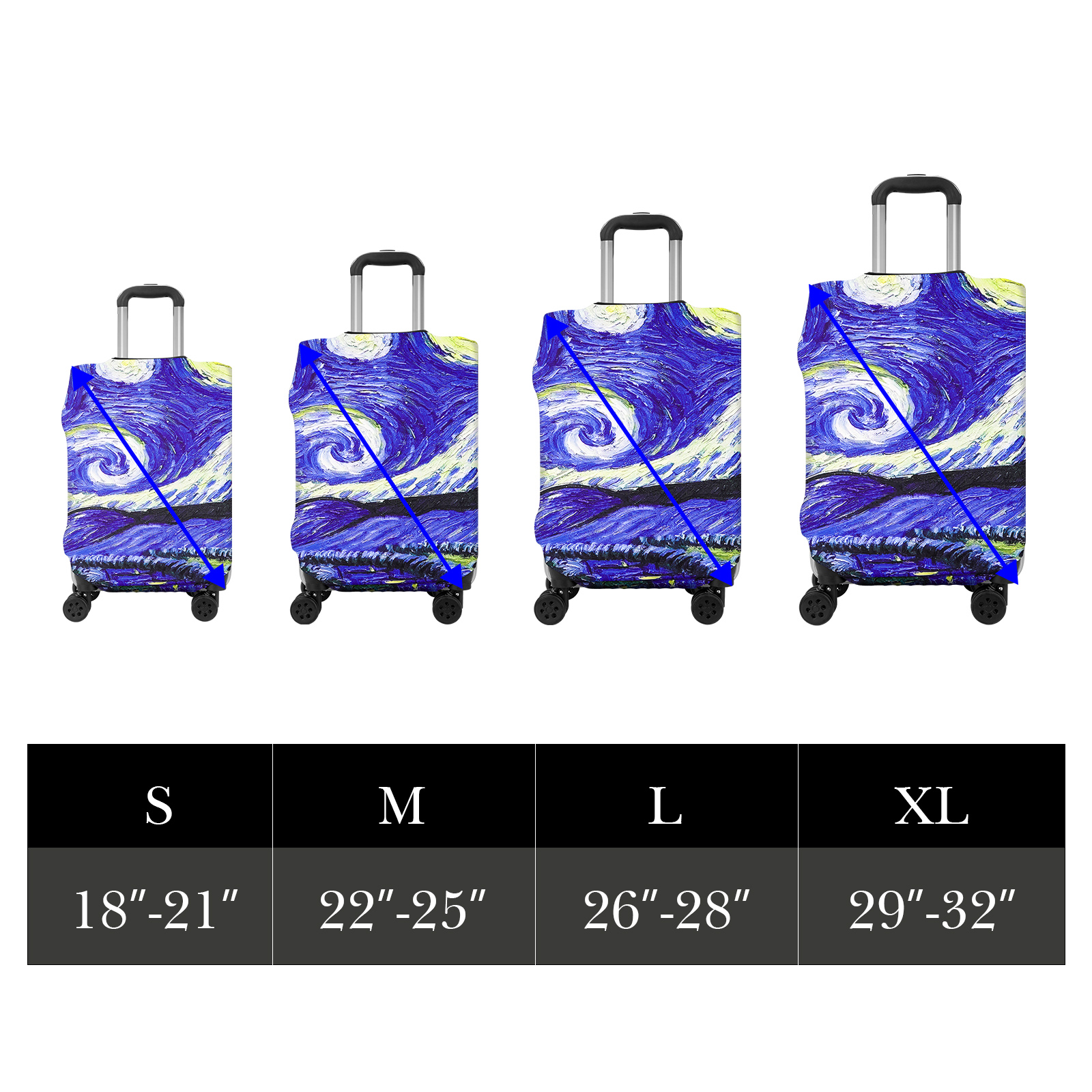 Travel luggage cover has 4 sizes available. S: fits 18-21 inch, M: fits 22-25 inch, L: fits 26-28 inch, XL: fits 29-32 inch. (Please measure the size of the suitcase before purchasing).