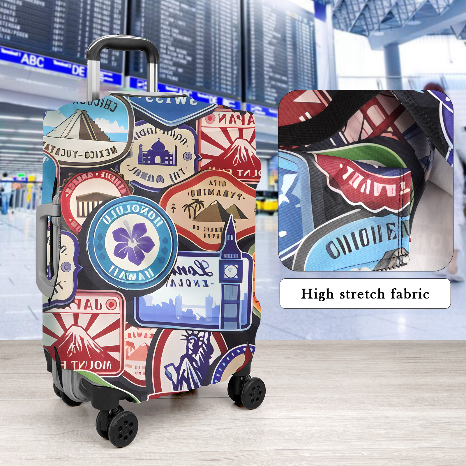 Suitcase protector made of elastic polyester, fits comfortably, provents luggage from getting dirty and scratched.