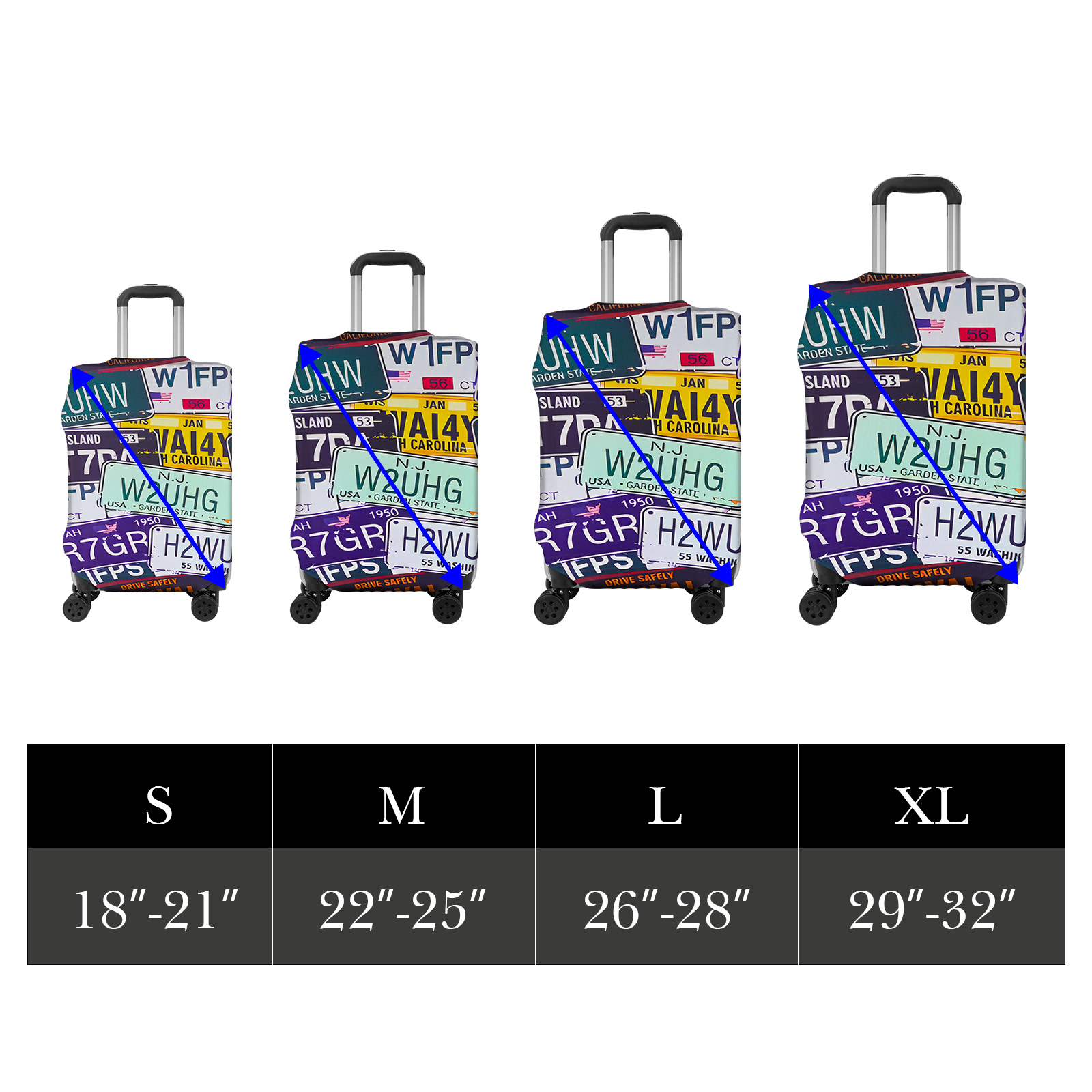 Travel luggage cover has 4 sizes available. S: fits 18-21 inch, M: fits 22-25 inch, L: fits 26-28 inch, XL: fits 29-32 inch. (Please measure the size of the suitcase before purchasing).