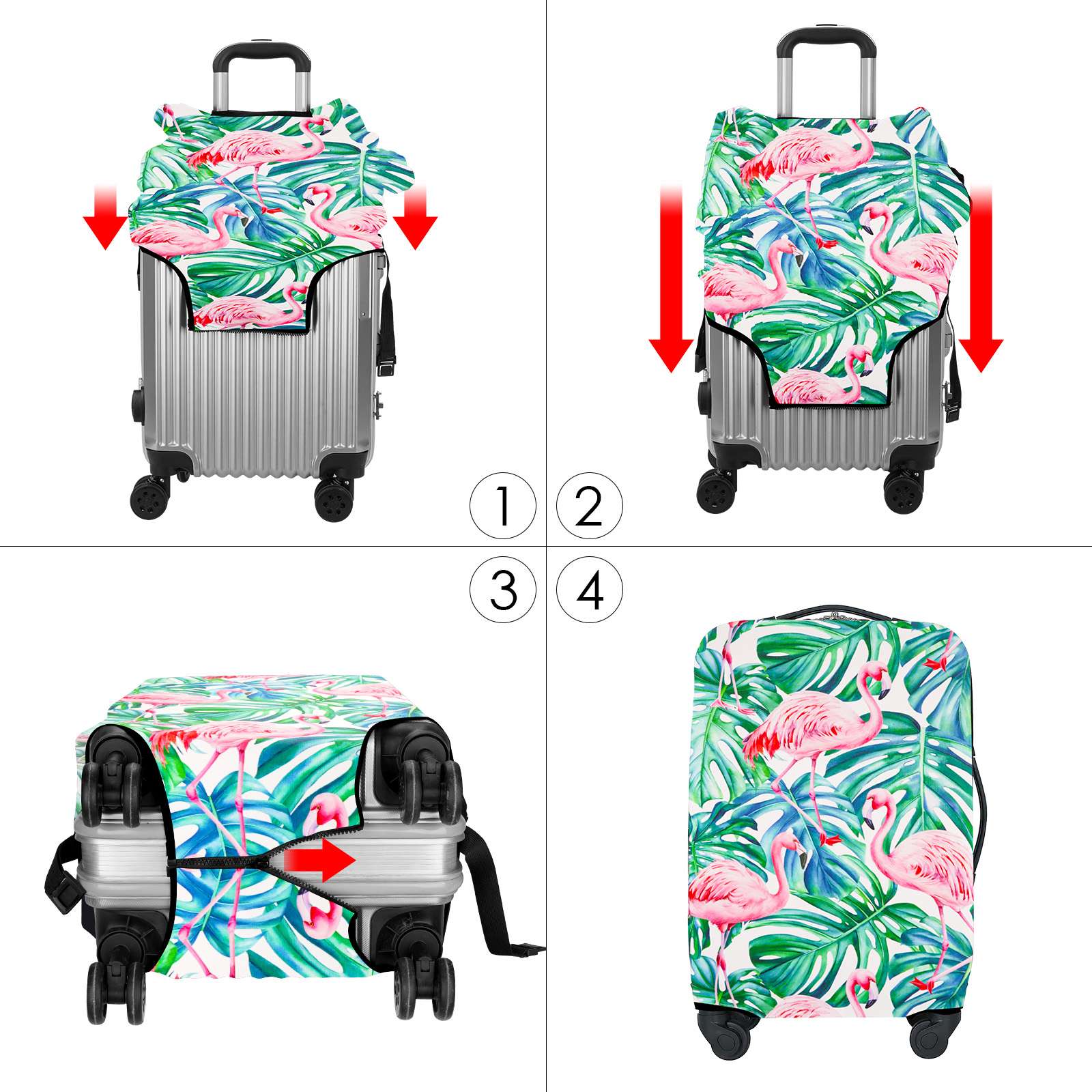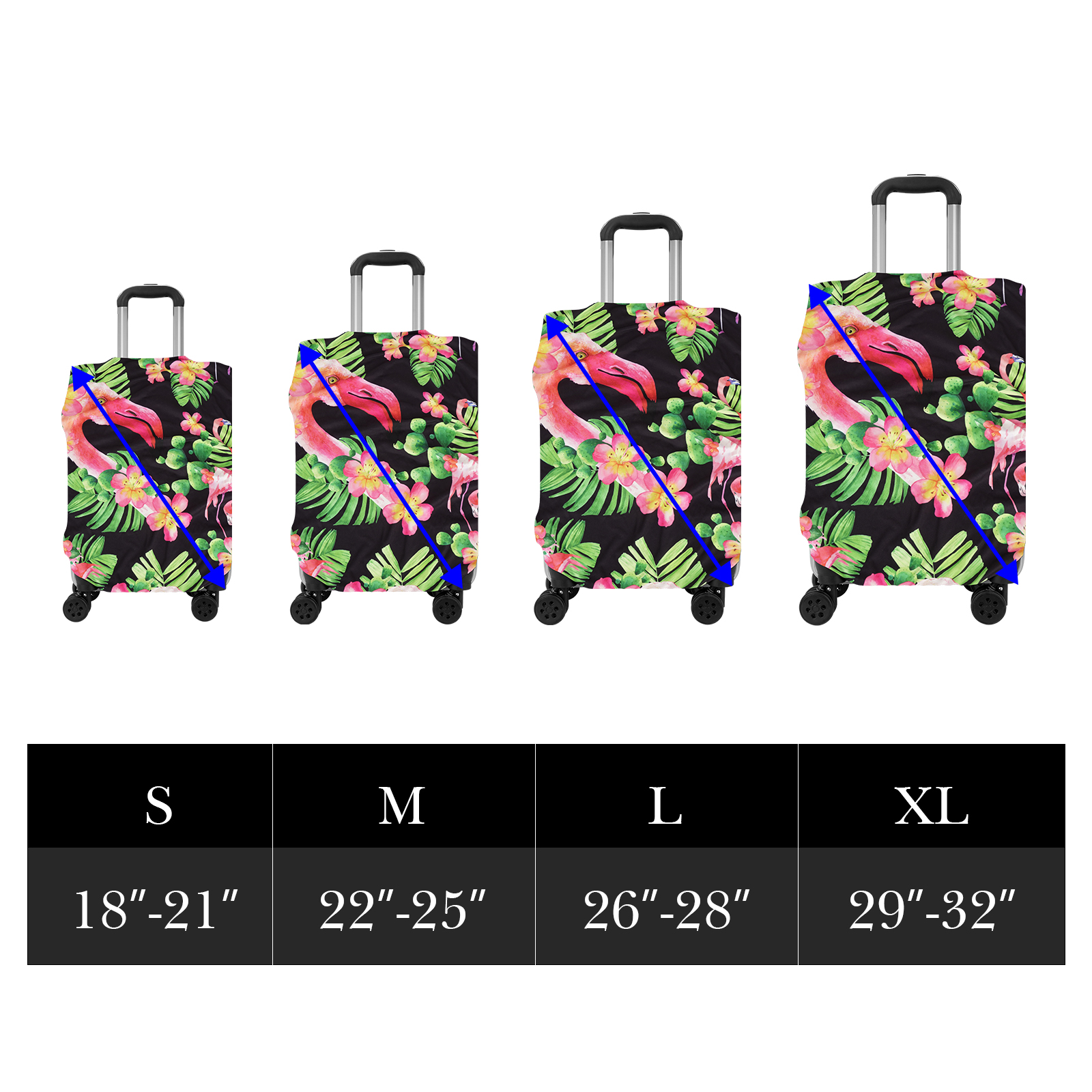 Travel luggage cover has 4 sizes available. M: fits 20-22 inch, L: fits 22-24 inch, XL: fits 24-26 inch, XXL: fits 26-29 inch. (Please measure the size of the suitcase before purchasing).